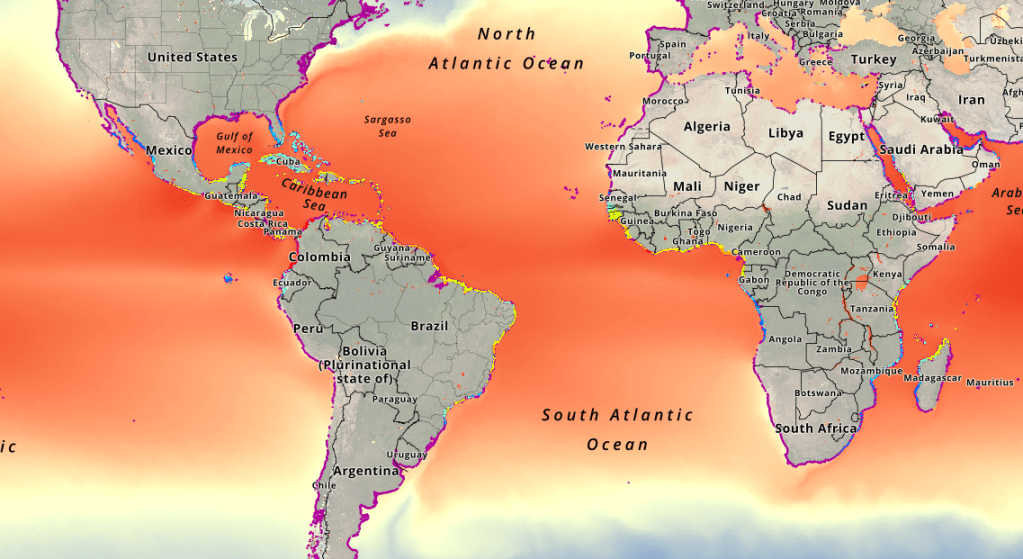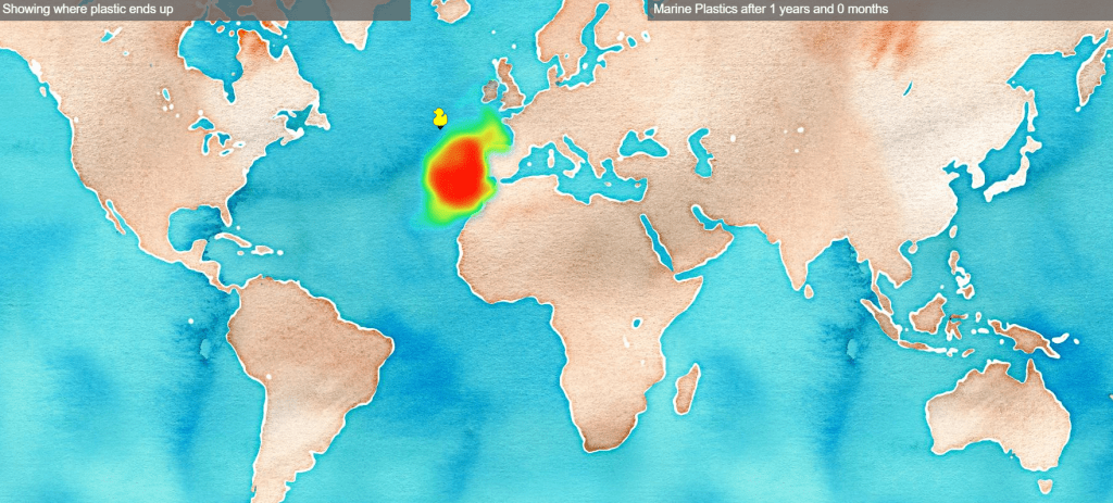 Another very interesting application of web mapping is the Plastic Adrift site where users can choose a location in the ocean on a global map to see the potential movement of marine plastics over time (Figure 16).