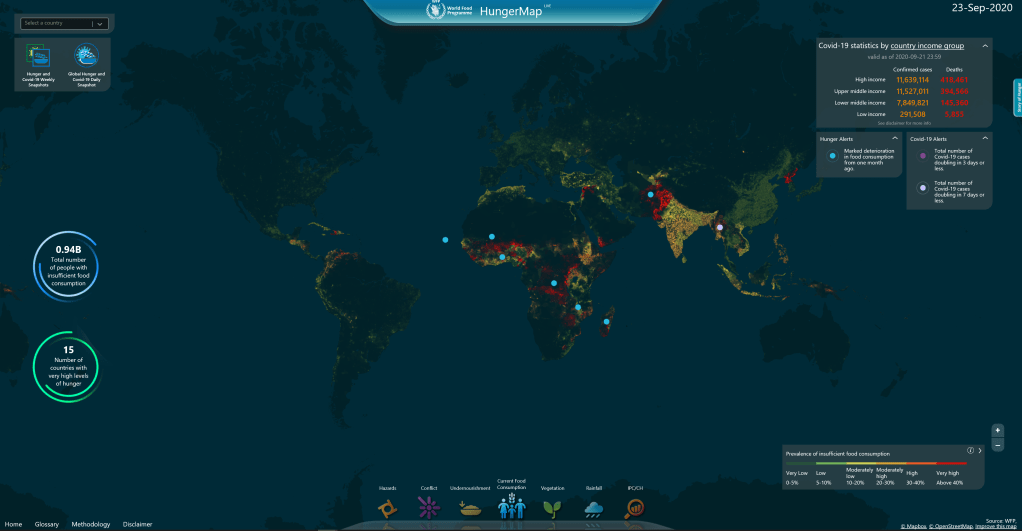 In addition to the pdf map above, the WFP also maintains a live “HungerMap” at a global scale (Fig. 5a), which now also includes statistics on Covid-19, provided by Johns Hopkins University. Furthermore, more detailed demographic and nutritional statistics can be studied at country level (Fig. 5b). The HungerMap is a global hunger monitoring system and was developed with the Mapbox open source mapping platform. It covers 94 countries, including lower and lower-middle income countries (as classified by the World Bank).